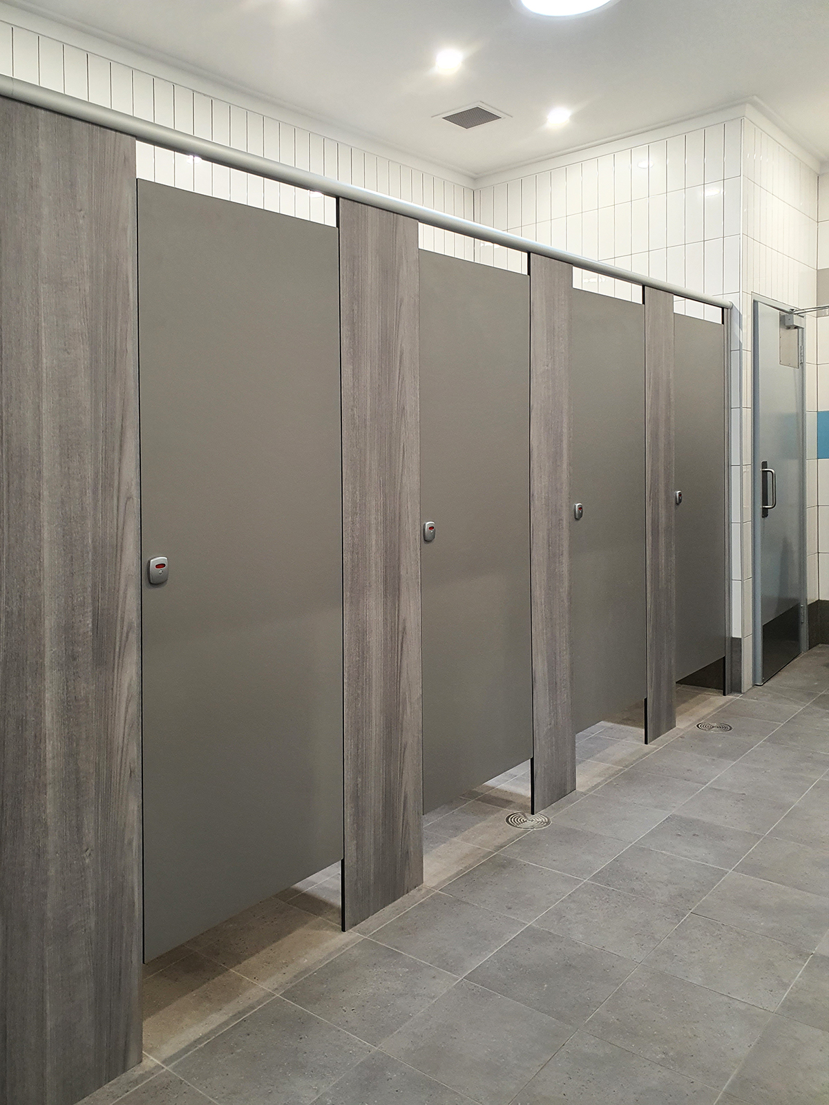 Aqualoo Regent Cubicles in Laminex Oyster Grey & Laminex Lustrous Elm